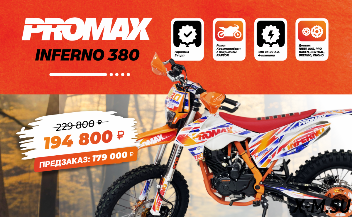 Дополнительная информацияЦена на товар Кроссовый мотоцикл PROMAX INFERNO 380 (4 valves, 6 gears) не является итоговой и может измениться в зависимости от валютных курсов, общей экономической ситуации или логистических и иных факторов.